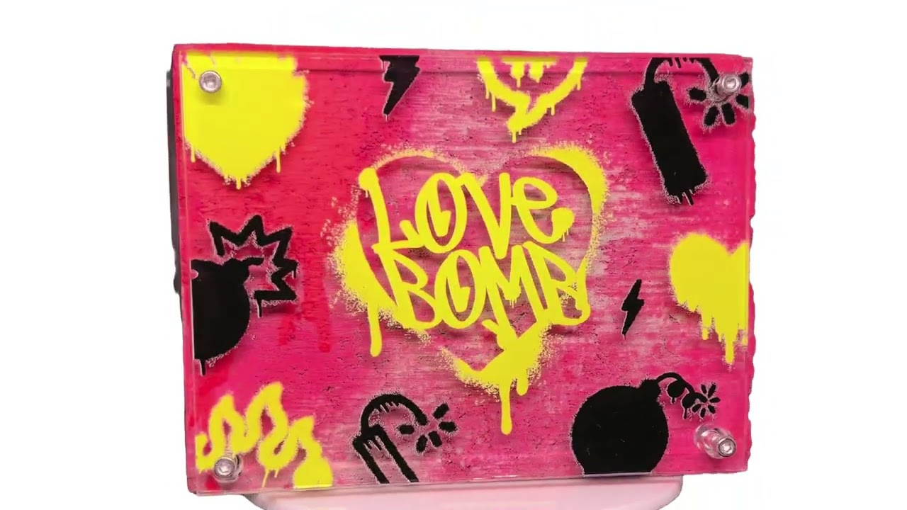 O produto une uma peça de acrílico vibrante com a frase "Love Bomb" e imagens de bombas estilizadas, evocando a ideia de que o amor, quando chega, vem com uma força incontrolável e transformadora. A base de concreto, com grafites urbanos, acrescenta um toque de modernidade e autenticidade, conectando a obra ao mundo contemporâneo e às suas expressões artísticas.